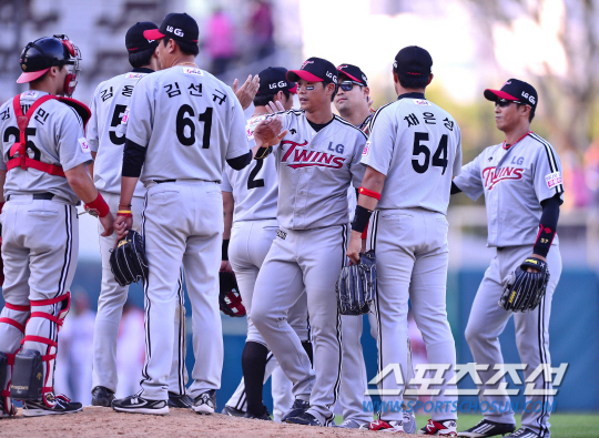 10일 오후 광주기아챔피언스필드에서 2014 프로야구 LG와 KIA의 경기가 열렸다. 12대6으로 대승을 거둔 LG 선수들이 하이파이브를 나누고 있다. 광주=김경민 기자 kyungmin@sportschosun.com / 2014.09.10. |