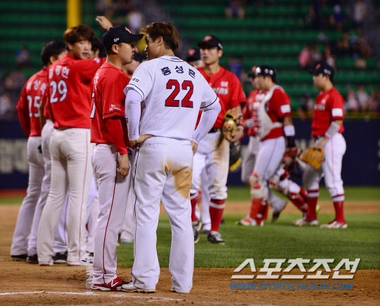 6일 오후 서울 잠실야구장에서 2014 프로야구 SK와 두산의 경기가 열렸다. 8대2로 SK가 승리한 후 두산 홍성흔이 박진만과 8회초 임훈의 도루에 대해 언쟁을 벌이고 있다. 잠실=김경민 기자 kyungmin@sportschosun.com / 2014.09.06. |