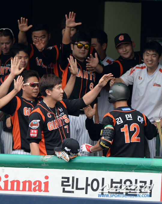 넥센과 롯데의 2014 프로야구 경기가 7일 목동구장에서 열렸다. 8회초 롯데 김민하가 넥센 손승락의 투구를 받아쳐 우중간 담장을 넘어가는 솔로홈런을 날렸다. 동료들과 기쁨을 나누는 김민하. 목동=허상욱 기자 wook@sportschosun.com