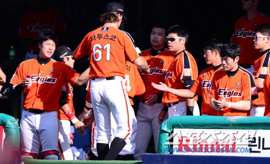 선두 삼성을 맹렬하게 쫓고 있는 넥센이 10일 목동에서 한화와 다시 만났다. 한화 선발 타투스코가 8회를 마치고 덕아웃의 동료들과 하이파이브를 하고 있다. 타투스코는 타선의 침묵으로 승리와는 인연이 없지만 넥센 강타선을 상대로 4점만 허락하는 투구를 선보였다. 목동=조병관기자 rainmaker@sportschosun.com
