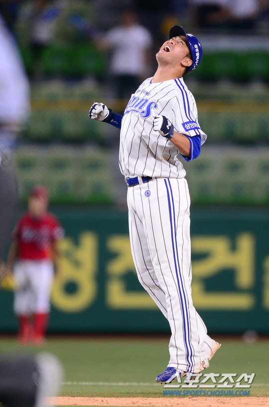 11일 오후 대구 시민구장에서 2014 프로야구 KIA와 삼성의 경기가 열렸다. 9회말 무사 1,2루서 끝내기 2루타를 친 삼성 채태인이 환호하고 있다. 대구=김경민 기자 kyungmin@sportschosun.com / 2014.09.11.