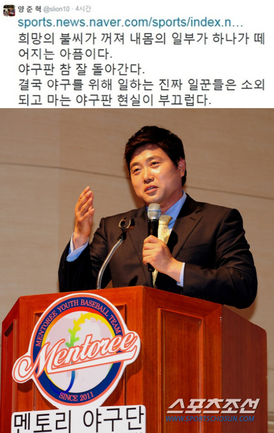 11일 양준혁은 자신의 트위터를 통해 "희망의 불씨가 꺼져 내 몸의 일부 하나가 떼어지는 아픔이다"며 "야구판 참 잘 돌아간다. 결국 야구를 위해 일하는 진짜 일꾼들은 소외되고 마는 야구판 현실이 부끄럽다"라며 안타까운 심경을 밝혔다.