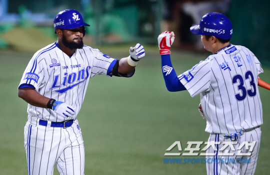 12일 오후 대구 시민구장에서 2014 프로야구 KIA와 삼성의 경기가 열렸다. 1회말 2사 1루서 삼성 나바로가 좌중월 2점 홈런을 친 후 홈에서 박한이와 하이파이브를 나누고 있다. 대구=김경민 기자 kyungmin@sportschosun.com