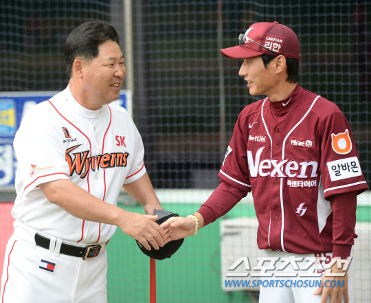 '1위 추격자' 넥센과 '4위 추격자' SK가 만났다. SK와 넥센의 2014 프로야구 경기가 11일 인천구장에서 열리는 가운데 경기 전 넥센 염경엽 감독과 SK 이만수 감독이 만나 반갑게 인사를 나누고 있다. 인천=정재근 기자cjg@sportschosun.com/2014.09.11/
