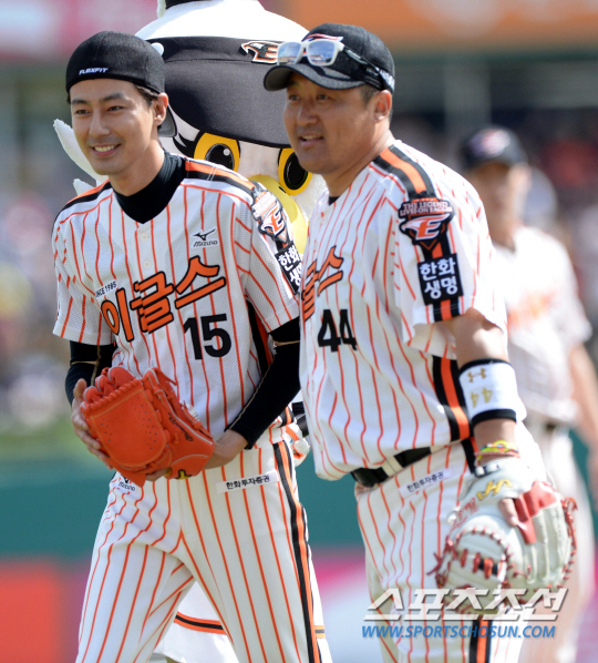이날 한화는 다채로운 행사를 벌였다. '레전드 데이'를 맞아 한화다이렉트존, 스카이박스, VIP커플석 관람객들을 대상으로 송진우 코치 버블헤드 인형을 증정했다. 특히 배우 조인성이 시구를 맡아 뜨거운 반응을 불러일으켰다. 조인성은 최근 SBS 드라마 '괜찮아, 사랑이야'의 주연 배우로 열연을 펼치며 인기몰이를 이어갔다.