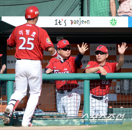 한화와 KIA의 2014 프로야구 경기가 14일 대전구장에서 열렸다. 5회초 KIA 이범호가 한화 앨버스의 투구를 받아쳐 우측담장을 넘어가는 솔로홈런을 날렸다. 선동열 감독과 기쁨을 나누는 이범호. 대전=허상욱 기자 wook@sportschosun.com