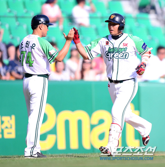 14일 오후 인천 문학구장에서 2014 프로야구 NC와 SK의 경기가 열렸다. 6회말 무사 1루서 SK 최정이 역전 2점 홈런을 친 후 조원우 코치와 하이파이브를 나누고 있다. 인천=김경민 기자 kyungmin@sportschosun.com