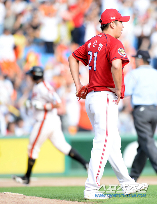 한화와 KIA의 2014 프로야구 경기가 14일 대전구장에서 열렸다. 6회말 한화 정범모가 KIA 송은범의 투구를 받아쳐 우중간담장을 넘어가는 솔로홈런을 날렸다. 홈런을 허용한 송은범이 아쉬워하는 모습. 대전=허상욱 기자 wook@sportschosun.com/2014.09.14/