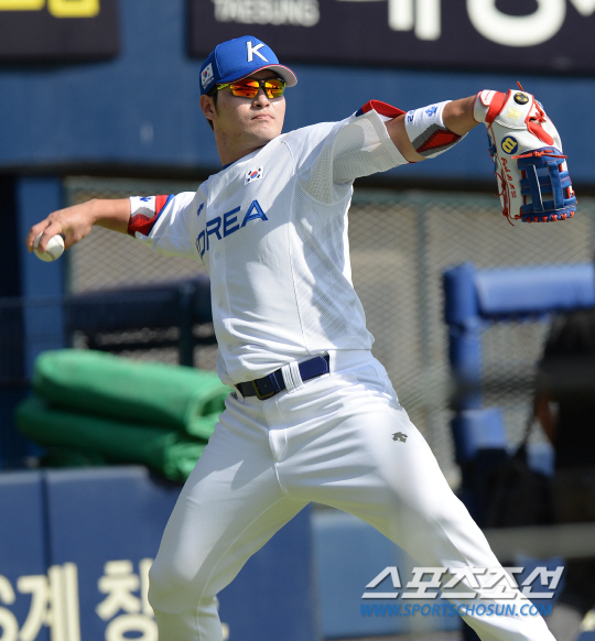 인천아시안게임에 출전하는 한국 야구대표팀 선수들이 16일 서울 잠실구장에서 공식 훈련을 시작했다. 박병호가 캐치볼을 하며 몸을 풀고 있다.