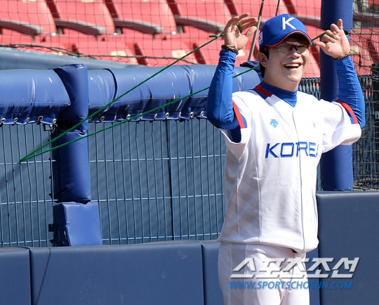 인천아시안게임에 출전하는 한국 야구대표팀 선수들이 16일 서울 잠실구장에서 공식 훈련을 시작했다. 양현종이 캐치볼 전 몸을 풀고 있다.