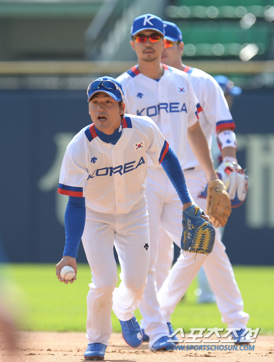 인천아시안게임에 출전하는 한국 야구대표팀 선수들이 16일 서울 잠실구장에서 공식 훈련을 시작했다. 김상수가 수비훈련을 하고 있다.