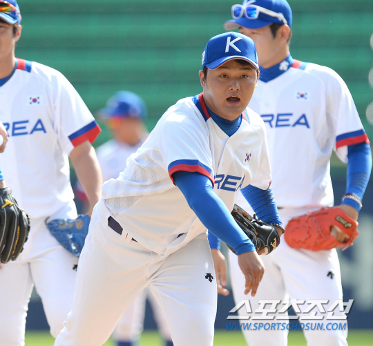 인천아시안게임에 출전하는 한국 야구대표팀 선수들이 16일 서울 잠실구장에서 공식 훈련을 시작했다. 홍성무가 수비훈련을 하고 있다.