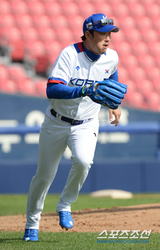 인천아시안게임에 출전하는 한국 야구대표팀 선수들이 16일 서울 잠실구장에서 공식 훈련을 시작했다. 봉중근이 수비훈련을 하고 있다.