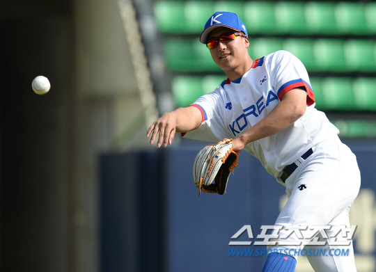 인천아시안게임에 출전하는 한국 야구대표팀 선수들이 16일 서울 잠실구장에서 공식 훈련을 시작했다. 황재균이 수비훈련을 하고 있다.