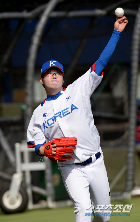 인천아시안게임에 출전하는 한국 야구대표팀 선수들이 16일 서울 잠실구장에서 공식 훈련을 시작했다. 양현종이 캐치볼을 하고 있다.