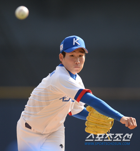 인천아시안게임에 출전하는 한국 야구대표팀 선수들이 16일 서울 잠실구장에서 공식 훈련을 시작했다. 이재학이 수비훈련을 위해 투구를 하고 있다.