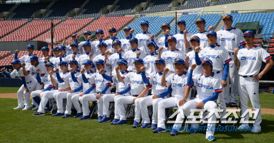인천아시안게임에 출전하는 한국 야구대표팀 선수들이 16일 서울 잠실구장에서 포토데이 행사를 열었다. 선수와 코칭스테프가 함께 모여 단체사진 촬영을 하며 화이팅을 외치고 있다. 잠실=정재근 기자cjg@sportschosun.com/2014.09.16/