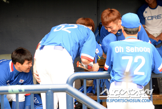인천아시안게임에 출전하는 한국 야구대표팀 선수들이 17일 잠실구장에서 훈련을 펼쳤다. 훈련 전 강민호가 주장 박병호에 90도 인사를 하자 박병호도 함께 인사를 하고 있다.