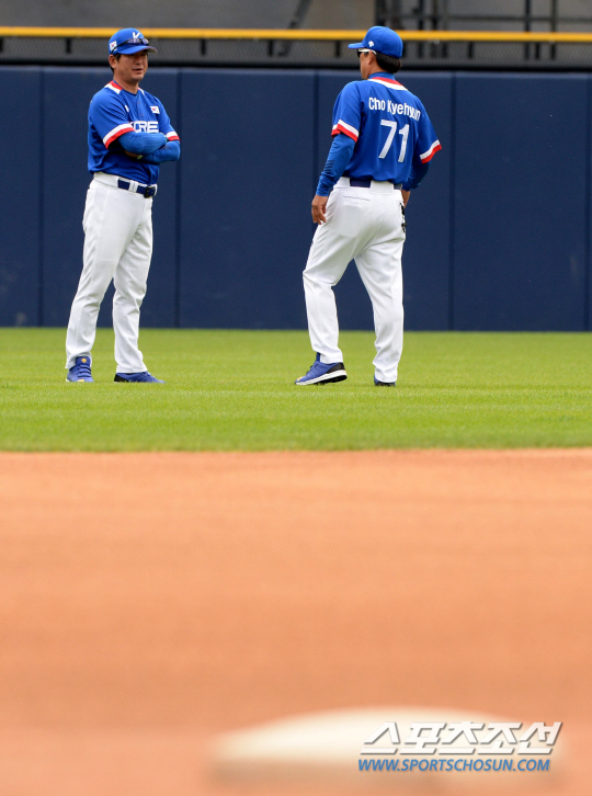 인천아시안게임에 출전하는 한국 야구대표팀 선수들이 17일 잠실구장에서 훈련을 펼쳤다. 류중일 감독과 조계현 코치가 이야기를 나누고 있다.