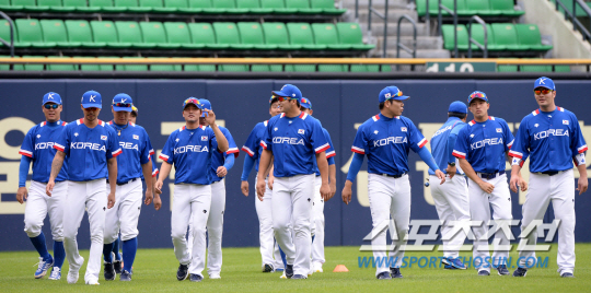 인천아시안게임에 출전하는 한국 야구대표팀 선수들이 17일 잠실구장에서 훈련을 펼쳤다. 선수들이 워밍업을 마치고 덕아웃으로 향하고 있다.
