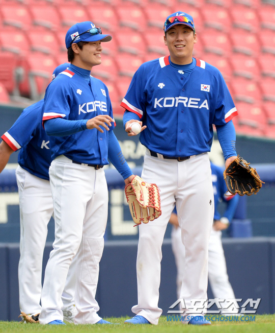 인천아시안게임에 출전하는 한국 야구대표팀 선수들이 17일 잠실구장에서 훈련을 펼쳤다. 김현수와 민병헌이 캐치볼을 하며 이야기를 나누고 있다.