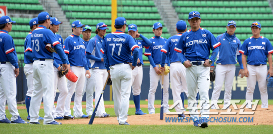 인천아시안게임에 출전하는 한국 야구대표팀 선수들이 17일 잠실구장에서 훈련을 펼쳤다. 류중일 감독이 선수들과 미팅을 갖고 있다.