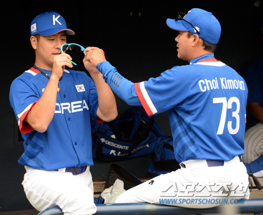 인천아시안게임에 출전하는 한국 야구대표팀 선수들이 17일 잠실구장에서 훈련을 펼쳤다. 훈련 전 강민호와 최기문 코치가 이야기를 나누고 있다.
