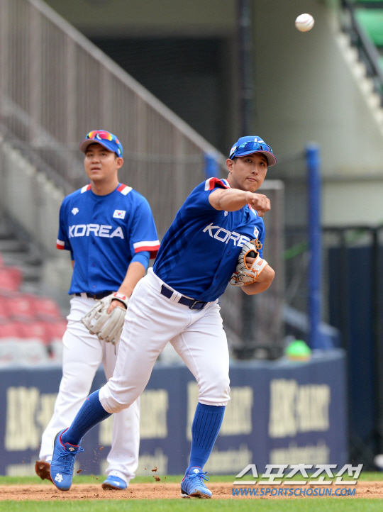인천아시안게임에 출전하는 한국 야구대표팀 선수들이 17일 잠실구장에서 훈련을 펼쳤다. 황재균과 김민성이 수비훈련을 하고 있다.