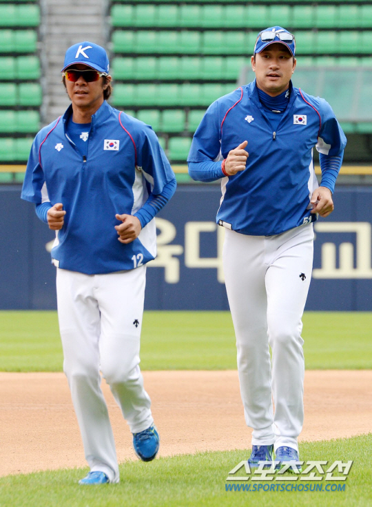 인천아시안게임에 출전하는 한국 야구대표팀 선수들이 17일 잠실구장에서 훈련을 펼쳤다. 워밍업을 마친 임창용과 봉중근이 덕아웃으로 향하고 있다.