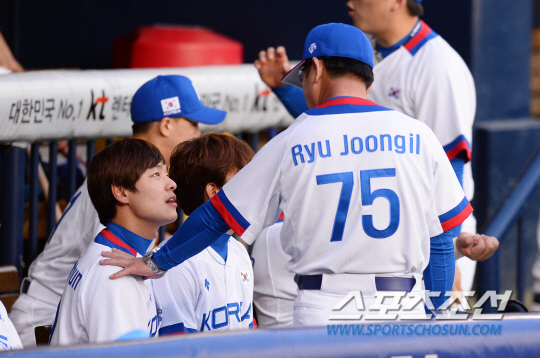 2014 인천아시안게임 야구대표팀과 LG트윈스의 연습경기가 18일 잠실야구장에서 열렸다. 경기전 류중일 대표팀 감독이 민병헌에게 말을 건네고 있다.