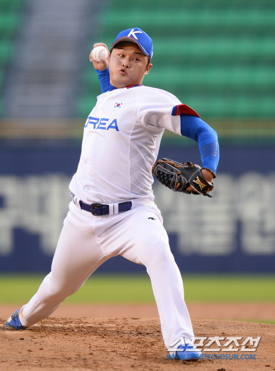 2014 인천아시안게임 야구대표팀과 LG트윈스의 연습경기가 18일 잠실야구장에서 열렸다. 대표팀 선발투수 홍성무가 LG 타선을 상대로 역투하고 있다.