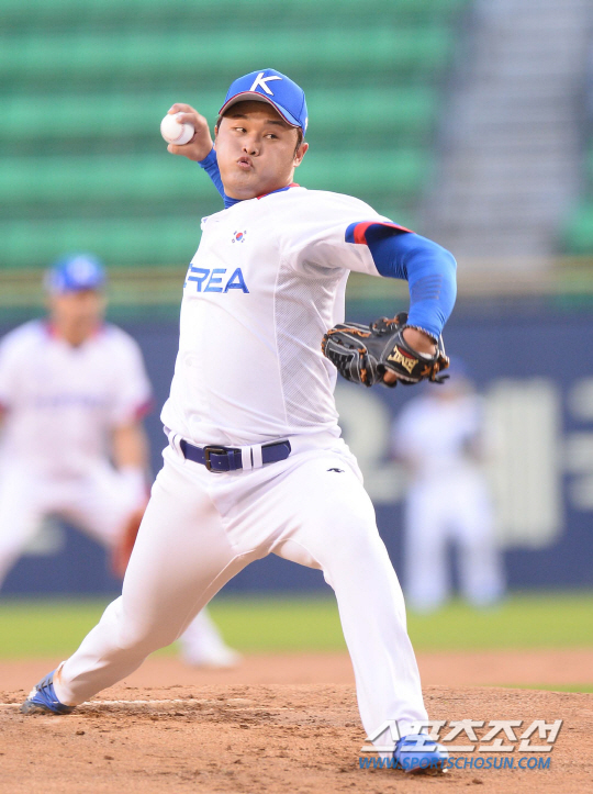 2014 인천아시안게임 야구대표팀과 LG트윈스의 연습경기가 18일 잠실야구장에서 열렸다. 대표팀 선발투수 홍성무가 LG 타선을 상대로 역투하고 있다.
