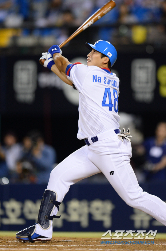 2014 인천아시안게임 야구대표팀과 LG트윈스의 연습경기가 18일 잠실야구장에서 열렸다. 대표팀 3회말 무사에서 나성범이 좌월 만루홈런을 치고있다.
