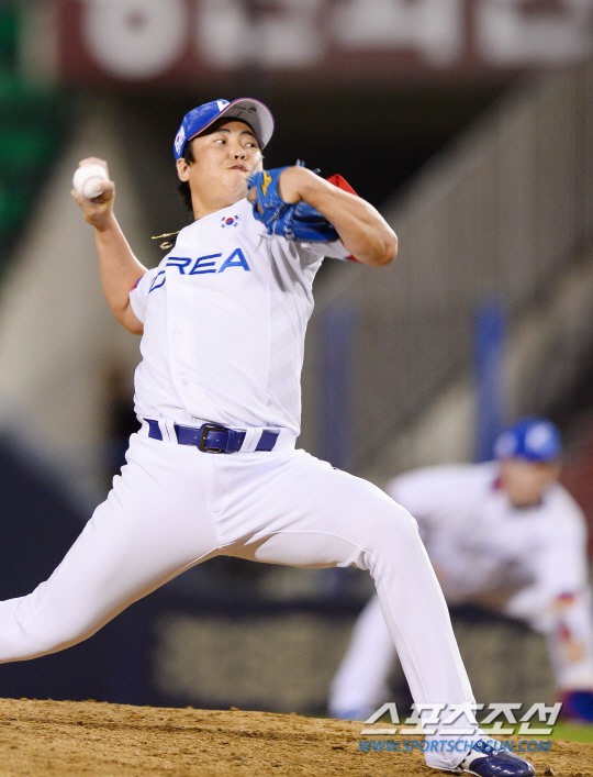 2014 인천아시안게임 야구대표팀과 LG트윈스의 연습경기가 18일 잠실야구장에서 열렸다. 대표팀 세번째 투수로 등판한 안지만이 LG 타선을 상대로 역투하고 있다.