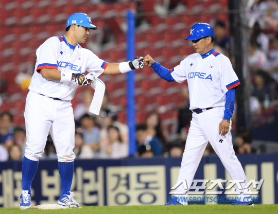 2014 인천아시안게임 야구대표팀과 LG트윈스의 연습경기가 18일 잠실야구장에서 열렸다. 대표팀 6회말 2사 1,3루에서 이재원이 1타점 적시안타를 치고 있다.
