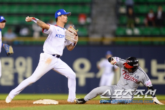 2014 인천아시안게임 야구대표팀과 LG트윈스의 연습경기가 18일 잠실야구장에서 열렸다. LG 8회초 1사 1루 정의윤의 병살타때 1루주자 박용근이 2루에서 포스아웃 되고있다.