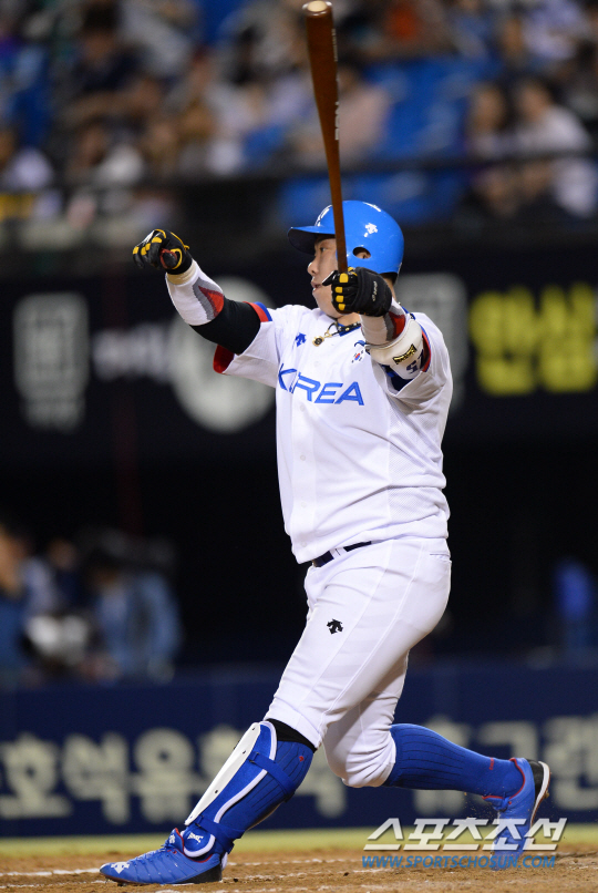 2014 인천아시안게임 야구대표팀과 LG트윈스의 연습경기가 18일 잠실야구장에서 열렸다. 대표팀 8회말 1사 1,2루에서 나지완이 2타점 적시2루타를 치고 있다.