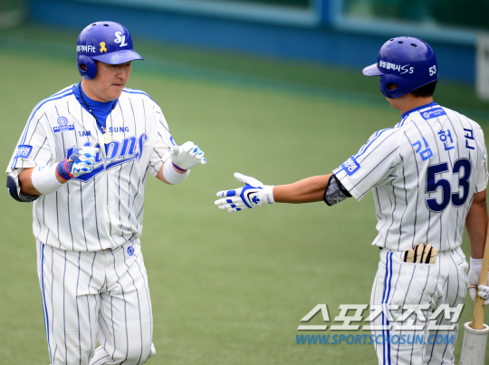 삼성 라이온즈의 4번타자 최형우는 3B0S의 극단적으로 유리한 볼카운트에서 공격적인 타격을 즐긴다. 올시즌 다섯 차례 타격을 해 홈런 1회에 안타 2회로 세 차례나 웃었다. 지난 5월 25일 넥센 히어로즈와의 홈경기에서 6회말 2사 주자 없는 상황에서 넥센 박성훈을 상대로 볼카운트 3B0S에서 솔로홈런을 때려낸 뒤 축하를 받고 있는 최형우. 이 홈런은 최형우의 통산 150호 홈런이었다. 대구=정재근 기자 cjg@sportschosun.com/2014.05.25/ |