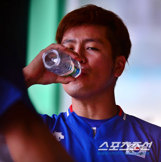 21일 오후 인천 문학야구장에서 2014 인천 아시안게임 야구대표팀의 공식 훈련이 열렸다. 대표팀 강민호가 훈련 도중 물을 마시고 있다. 인천=김경민 기자 kyungmin@sportschosun.com / 2014.09.21.