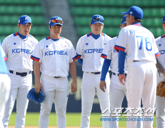 인천아시안게임에 출전하는 한국 야구대표팀 선수들이 16일 서울 잠실구장에서 공식 훈련을 시작했다. 유지현코치가 투수들을 모아놓고 수비훈련에 대해 이야기하고 있다. 잠실=정재근 기자cjg@sportschosun.com/2014.09.16/