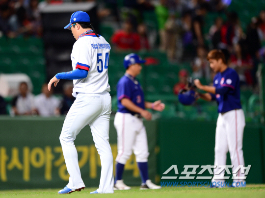 야구 대표팀이 24일 인천 문학야구장에서 2014 인천아시아경기대회 야구 B조 예선 2차전 대만과 경기를 펼쳤다. 아시안게임 금메달을 목표로 뛰고 있는 대표팀은 B조 1위를 놓고 대만과 피할 수 없는 대결을 펼쳤다. 선발로 등판한 투수 양현종이 1회 2사 3루의 위기에서 대만 4번타자 천쥔시우를 삼진으로 처리하며 이닝을 마쳤다. 마운드를 내려오고 있는 양현종.