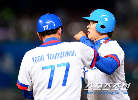 야구 대표팀이 24일 인천 문학야구장에서 2014 인천아시아경기대회 야구 B조 예선 2차전 대만과 경기를 펼쳤다. 아시안게임 금메달을 목표로 뛰고 있는 대표팀은 B조 1위를 놓고 대만과 피할 수 없는 대결을 펼쳤다. 1회 선두타자 민병헌이 안타를 치고 1루에 출루하고 있다.
