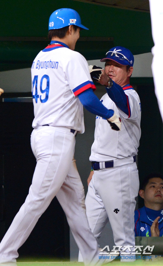 야구 대표팀이 24일 인천 문학야구장에서 2014 인천아시아경기대회 야구 B조 예선 2차전 대만과 경기를 펼쳤다. 아시안게임 금메달을 목표로 뛰고 있는 대표팀은 B조 1위를 놓고 대만과 피할 수 없는 대결을 펼쳤다. 1회 무사 1,2루에서 김현수의 2루타 때 득점에 성공한 민병헌이 류중일 감독과 하이파이브를 나누고 있다.