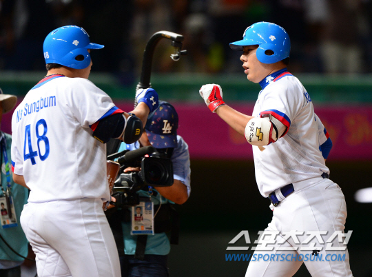 야구 대표팀이 24일 인천 문학야구장에서 2014 인천아시아경기대회 야구 B조 예선 2차전 대만과 경기를 펼쳤다. 아시안게임 금메달을 목표로 뛰고 있는 대표팀은 B조 1위를 놓고 대만과 피할 수 없는 대결을 펼쳤다. 1회 무사 2, 3루에서 강정호가 대만 왕야오린을 상대로 좌중월 3점홈런을 날렸다. 홈에서 나성범(왼쪽)과 하이파이브를 나누고 있는 강정호.