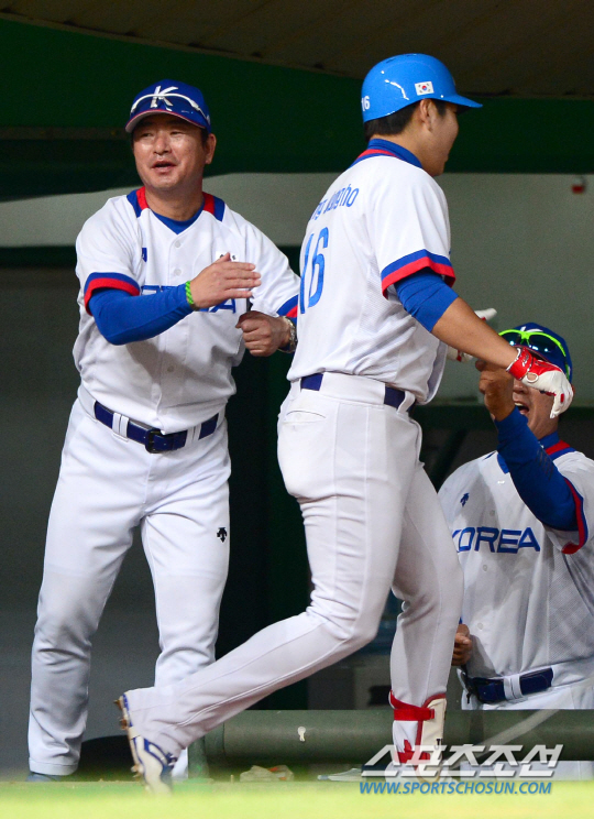 야구 대표팀이 24일 인천 문학야구장에서 2014 인천아시아경기대회 야구 B조 예선 2차전 대만과 경기를 펼쳤다. 아시안게임 금메달을 목표로 뛰고 있는 대표팀은 B조 1위를 놓고 대만과 피할 수 없는 대결을 펼쳤다. 1회 무사 2, 3루에서 강정호가 대만 왕야오린을 상대로 좌중월 3점홈런을 날렸다. 덕아웃에서 류중일 감독(왼쪽)과 하이파이브를 나누고 있는 강정호.