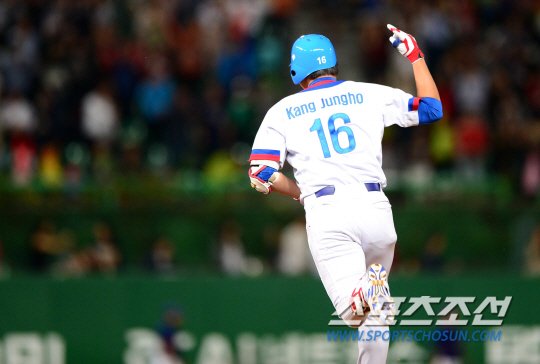 야구 대표팀이 24일 인천 문학야구장에서 2014 인천아시아경기대회 야구 B조 예선 2차전 대만과 경기를 펼쳤다. 아시안게임 금메달을 목표로 뛰고 있는 대표팀은 B조 1위를 놓고 대만과 피할 수 없는 대결을 펼쳤다. 1회 무사 2, 3루에서 강정호가 대만 왕야오린을 상대로 좌중월 3점홈런을 날렸다. 손을 들어보이며 그라운드를 돌고 있는 강정호. 인천=송정헌 기자 songs@sportschosun.com/2014.09.24