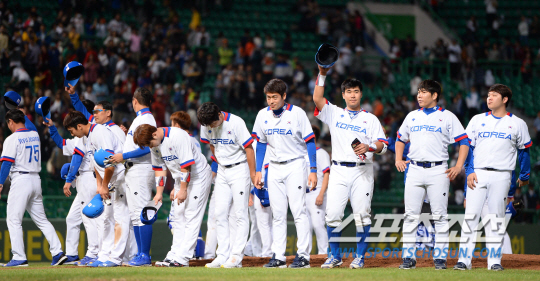 야구 대표팀이 24일 인천 문학야구장에서 2014 인천아시아경기대회 야구 B조 예선 2차전 대만과 경기를 펼쳤다. 대표팀이 대만에 8회 10대0 콜드게임 승리를 거뒀다. 경기 종료 후 팬들에게 인사를 건내고 있는 대표팀 선수들.