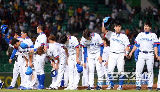 야구 대표팀이 24일 인천 문학야구장에서 2014 인천아시아경기대회 야구 B조 예선 2차전 대만과 경기를 펼쳤다. 대표팀이 대만에 8회 10대0 콜드게임 승리를 거뒀다. 경기 종료 후 팬들에게 인사를 건내고 있는 대표팀 선수들.
