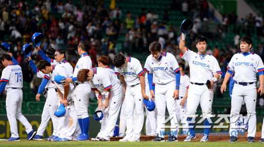 야구 대표팀이 24일 인천 문학야구장에서 2014 인천아시아경기대회 야구 B조 예선 2차전 대만과 경기를 펼쳤다. 대표팀이 대만에 8회 10대0 콜드게임 승리를 거뒀다. 경기 종료 후 팬들에게 인사를 건내고 있는 대표팀 선수들.