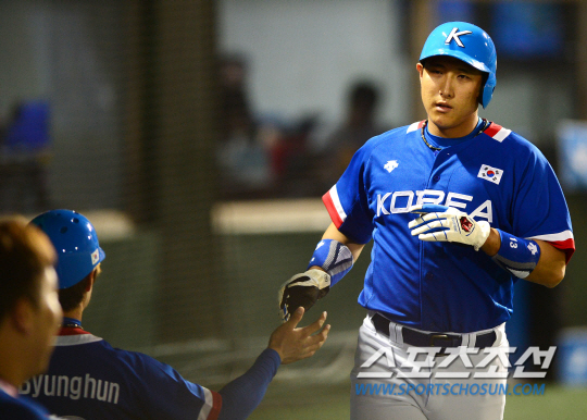 인천 아시안게임 야구대표팀이 25일 목동구장에서 홍콩과 조별리그 3차전 경기를 펼쳤다. 2회초 무사 3루 강민호의 우익수 희생플라이 때 3루주자 황재균이 홈인하고 있다.